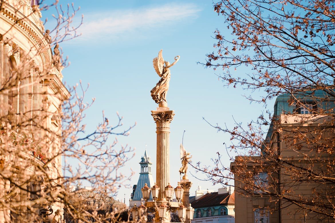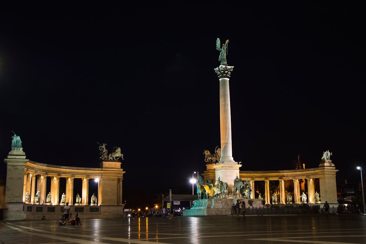 Situated at the end of Andrássy Avenue, Heroes’ Square is one of the most important and recognizable public spaces in Budapest. This large square features a central monument with the Archangel Gabriel holding the Holy Crown, surrounded by statues of the seven chieftains of the Magyars who founded Hungary.
