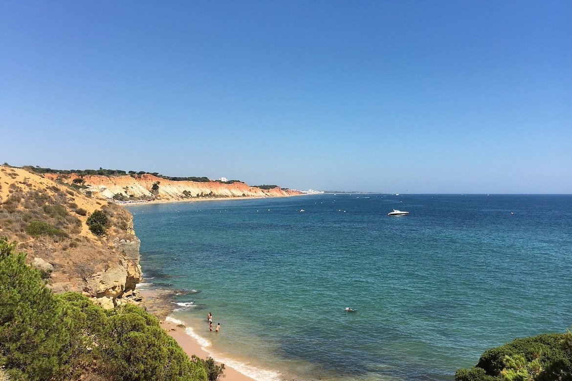 Praia da Falesia is defined by towering red and ochre cliffs that contrast with deep blue Atlantic waters. Long coastal walks along the cliff tops provide sweeping views. The beach remains a favorite from April through October.